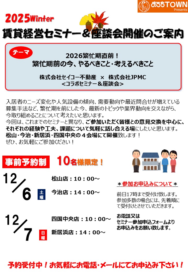 愛媛県の賃貸情報は、物件数が豊富な おうちTOWN ㈱セイコー不動産 へお任せください。